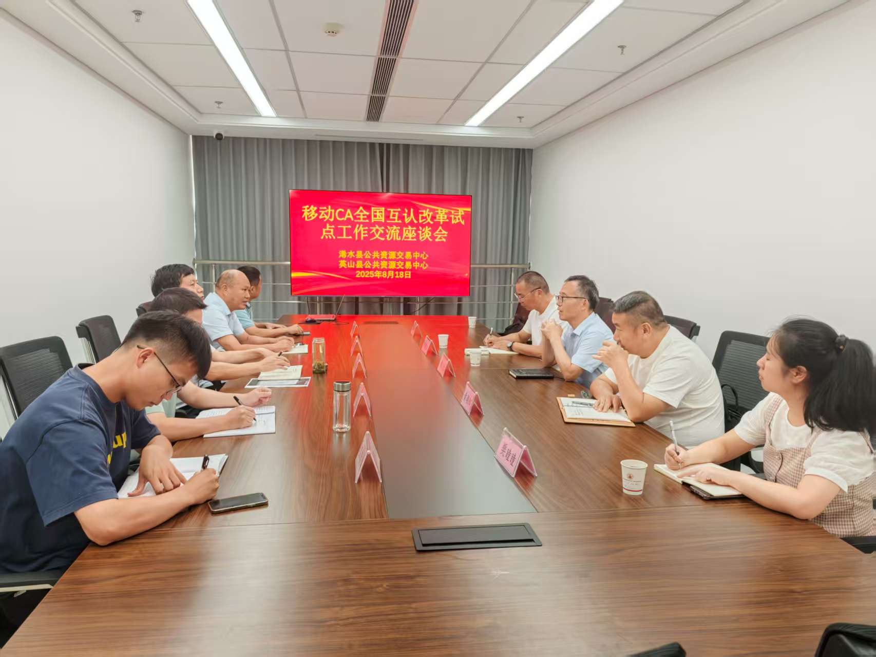 考察组一行实地参观了英山县公共资源交易中心开标大厅、远程异地评标室、监控中心等功能区域。在随后召开的专题座谈会上,双方就移动CA改革事项推进情况进行了交流,详细了解了英山县在移动CA全国互认工作中的推进路径、宣传推广途径以及取得的成效,并对下一步建立常态化沟通协作机制,持续拓展在移动CA全国互认、智能辅助评标、数字见证、全流程电子化等改革事项合作进行了深入探讨。